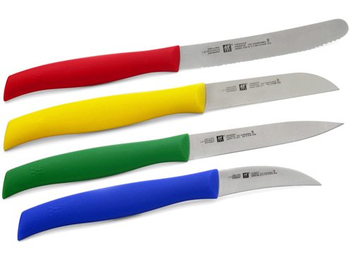 Designed with molded, slip-resistant plastic handles so the ideal knife for any job is always easy to identify. Set includes a 4.5" serrated spreader, a 3" paring knife, a 4" utility knife and a 2.25" bird's beak paring knife. With Henckels-quality, high-carbon stainless-steel blades. Manufacturer's lifetime warranty.